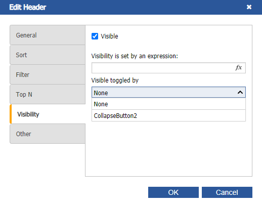 也可以通过在所需单元格的设置窗口中打开 "可见性 "选项卡,为其他标题单元格配置该按钮的操作条件。然后,您需要在 "可见性按按钮切换 "下拉列表中选择所需的按钮:
