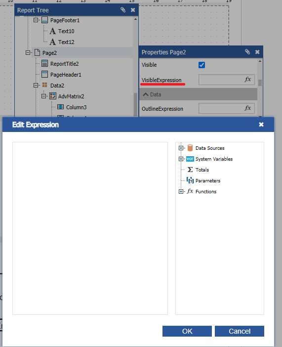 现在,在 FastReport Online Designer 中编辑报告模板时,可以设置页面显示条件。VisibleExpression 属性用于此目的。您可以在属性面板中手动或使用表达式编辑器设置其值。