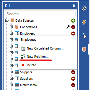 FastReport Online Designer 2024.2 现在具有在数据源中的表之间创建关系的功能。为此,请调用表的上下文菜单并选择 "新建连接":