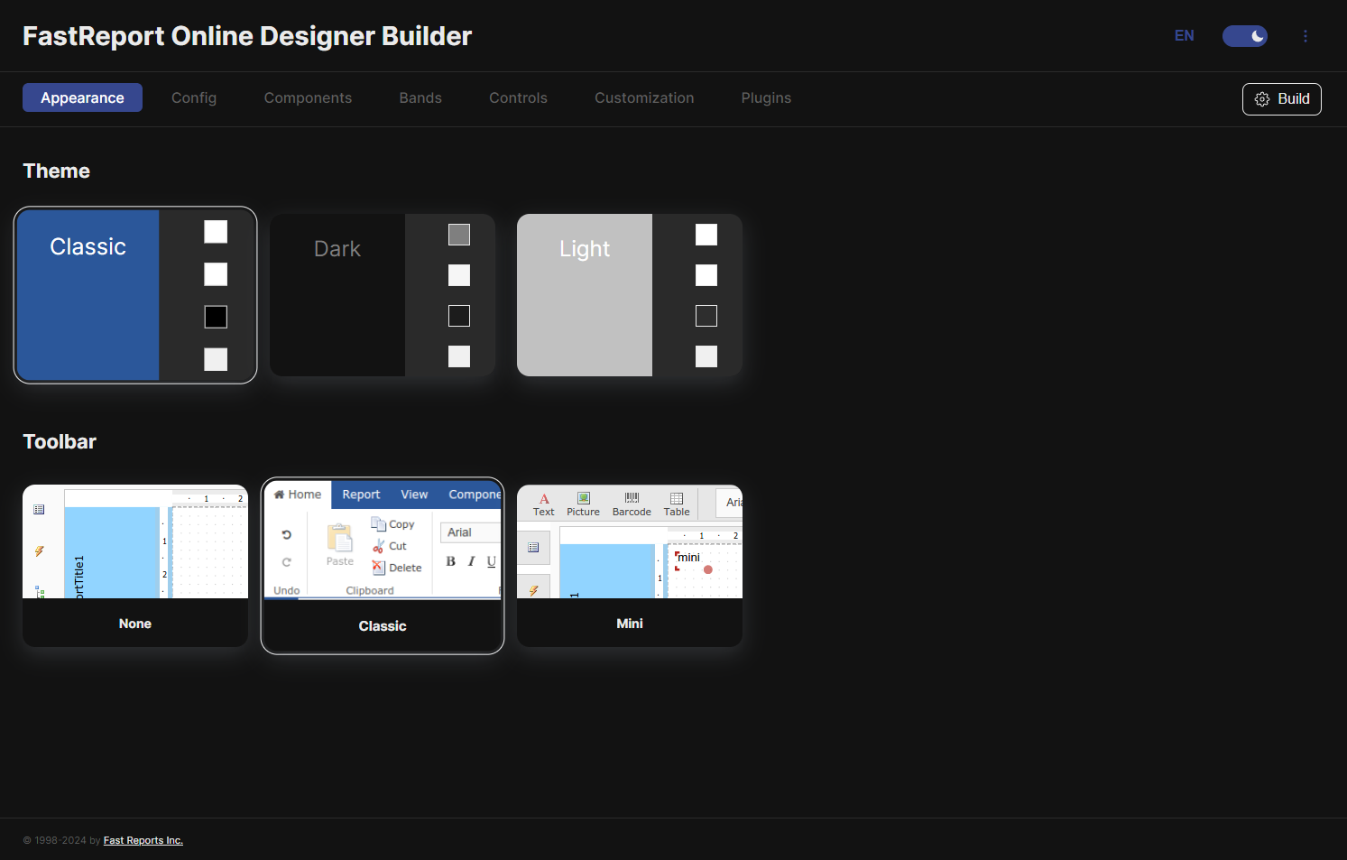 FastReport 在线设计器生成器也实施了新版本。设计和用户体验得到了改进,并根据用户要求创建了一个深色主题。