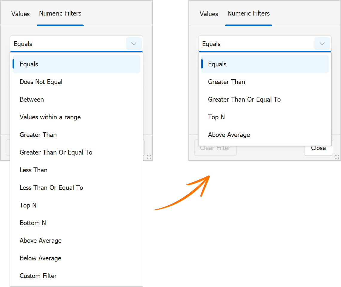 WinForms 数据网格控件公开ShowFilterPopupExcel事件,并允许您从Excel 样式过滤器下拉列表的“过滤器”和“值”选项卡中隐藏特定过滤器选项。v24.1 向事件参数添加了e.HideFilter(filterType)方法,用于对过滤器菜单进行高级自定义。使用此方法可以从“过滤器”选项卡中隐藏不必要的过滤器运算符。