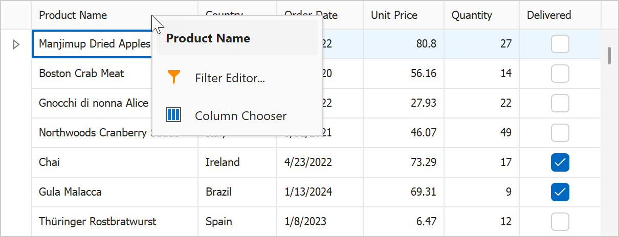 检查数据网格列自定义菜单中的项目。
