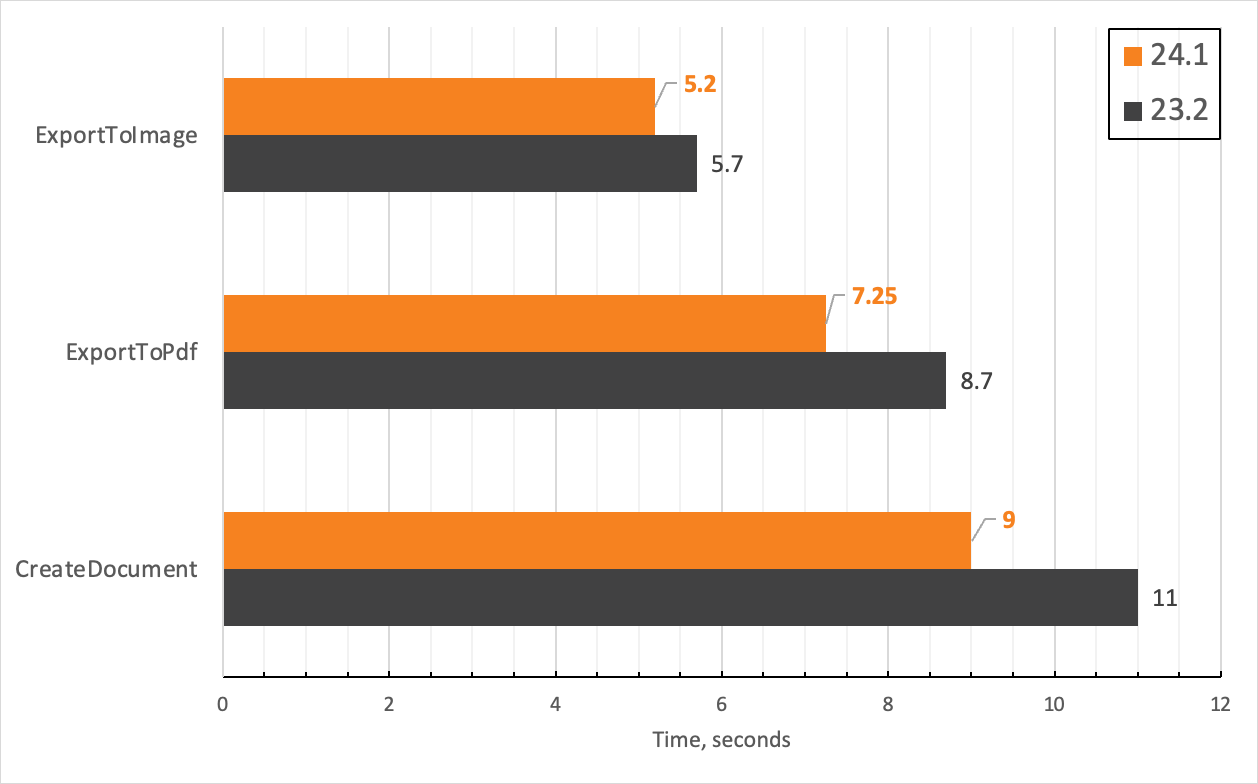 我们重构了跨平台绘图引擎的实现:我们添加了字体内部缓存并优化了动态内存分配。我们的内部测试表明,在生成 1500 页的基于文本的报告(平均 25 次迭代)时,有以下改进: