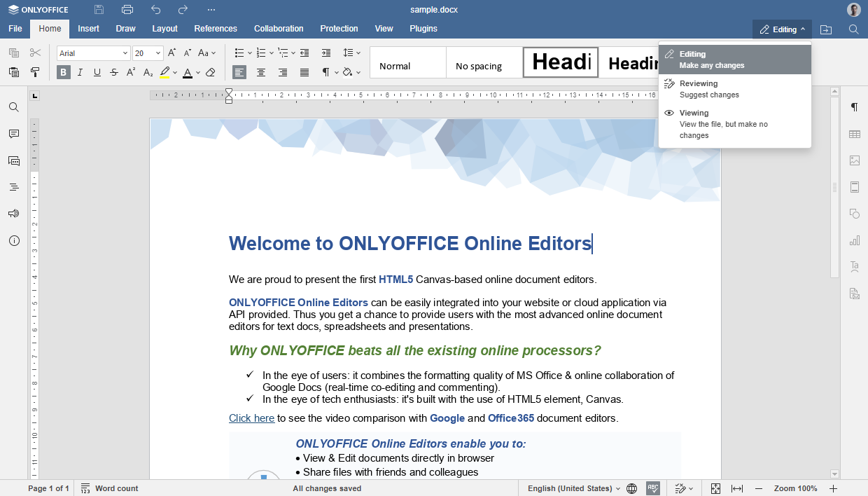 模式间无缝切换。只需单击一下,即可在编辑、审阅或查看模式之间进行切换。重要的是,这对每个用户都是单独生效的。因此,您不会影响或打扰其他共同作者。