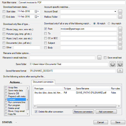 Aspose SDK 提供了一个非常简单的应用程序接口,大大减少了将一种格式转换为另一种格式所需的时间。 解决方案包括在下载附件完成后运行的规则过滤操作中添加 "转换 "选项。