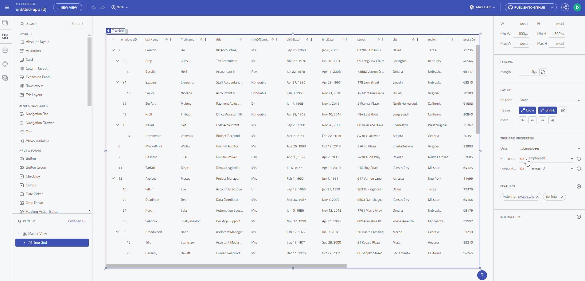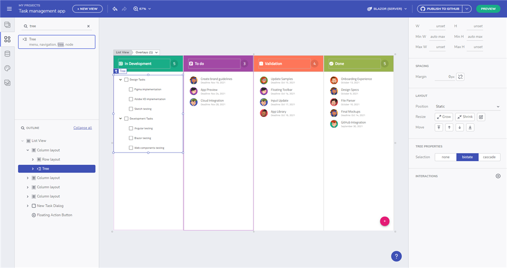 我们现在有一个树组件作为工具箱的一部分,您可以使用它在分层数据结构中进行可视化和导航。Ignite UI 树组件还通过 内置复选框、内置键盘导航等提供项目激活、双态和级联项目选择。Tree 的当前版本不支持数据绑定。您可以在此处的 App Builder 中测试树组件 - https://appbuilder.indigo.design/app/a3w5ubpbycfz/preview