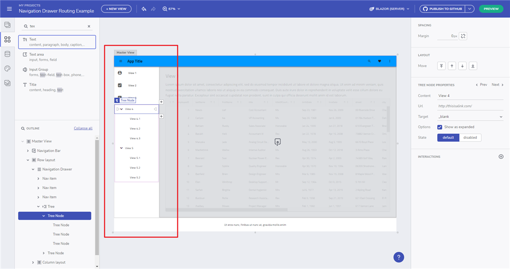Navigation Drawer 现在有一个可放置区域,您可以添加像树这样的组件。您可以在此处的 App Builder 中测试 Navigation Drawer 组件 - https://appbuilder.indigo.design/app/2d7wdqid75ld/preview