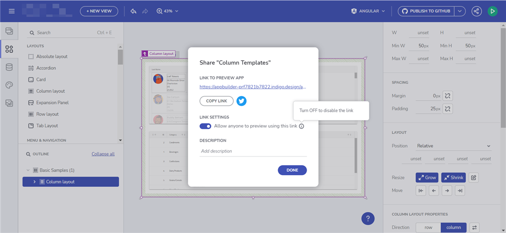 与他人共享应用程序从未如此简单。在此版本中,我们为各种情况添加了共享和预览功能。您现在可以单击预览模式旁边的“共享”图标,复制应用程序 URL 以及描述、共享功能许可或 Twitter 直接共享等设置。 通过应用程序的“更多操作”图标,共享按钮也将出现在工作区视图中。您可以通过切换“允许任何人使用此链接预览”来自定义共享体验,您还会看到一个警告图标,其中提供了其他信息,如果要禁用该链接,您应该关闭该开关。