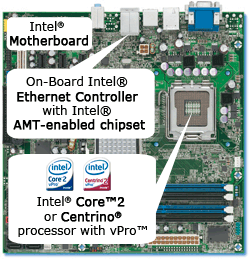 您的主板必须支持 vPro™ 技术的处理器(支持 vPro™ 的英特尔® 迅驰® 处理器或支持 vPro™ 的英特尔® 酷睿™2 处理器)。 这意味着您的主板已包含一个支持英特尔® AMT 芯片组的板载以太网控制器。