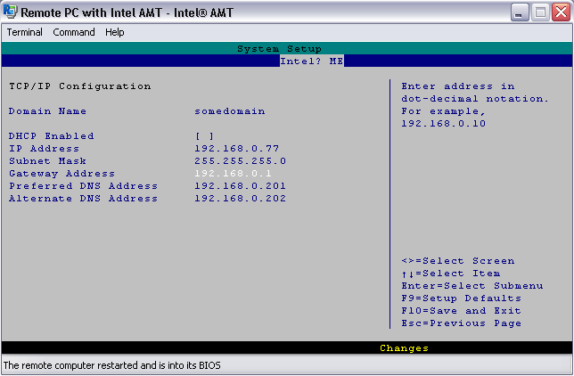 主机名和 IP 地址: 如果选择静态 IP,则必须为英特尔 ME 设置独立的主机名和 IP 地址,而不是主机 CPU。 如果选择 DHCP,则英特尔 ME 的主机名和 IP 地址与主机 CPU 的主机名和 IP 地址相同。