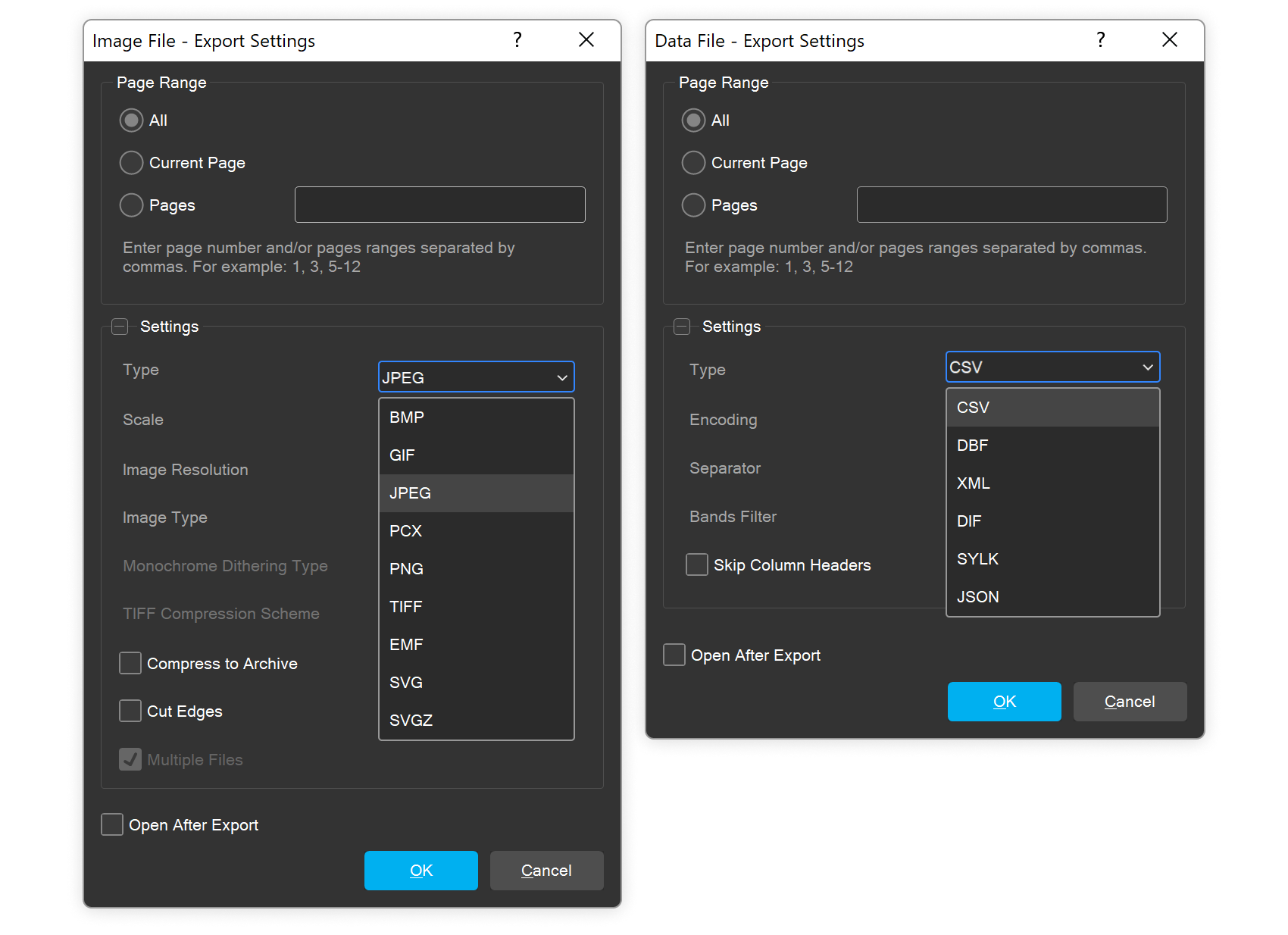 在 2024.3 版中,扩展了 JS、PHP 和 Python 组件对导出报告时各种文件格式的支持。 现在,报告可以转换成 CSV、JSON、XML、DBF、DIF 和 SYLK 等常用数据格式。 报告还可以导出为图像文件,包括 BMP、GIF、JPEG、PCX、PNG、TIFF、SVG 和 SVGZ。 此外,报告还可以转换为 RTF(富文本)文件。