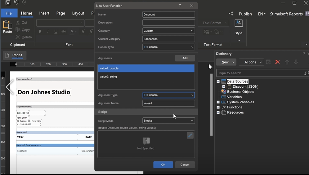 我们增加了在数据字典中创建用户函数的功能。 可以使用可视化编程工具 Blockly 或作为报告脚本语言安装的编程语言之一来描述函数: JS、C# 或 VB.NET。 这些功能可在报告和仪表盘中使用。