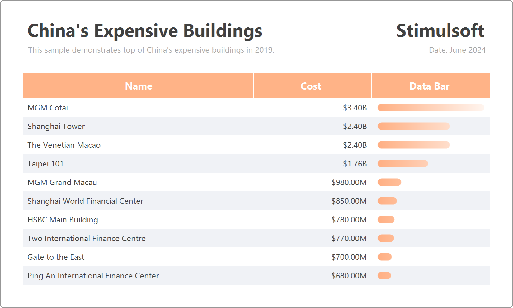 在此版本中,我们扩展了报表中数据条条件图形元素的设计功能。 现在,您可以对数据条的边缘进行圆角处理,指定填充,并将数据条与该组件中的内容之间的交互定义为 "叠加 "或 "内部"。