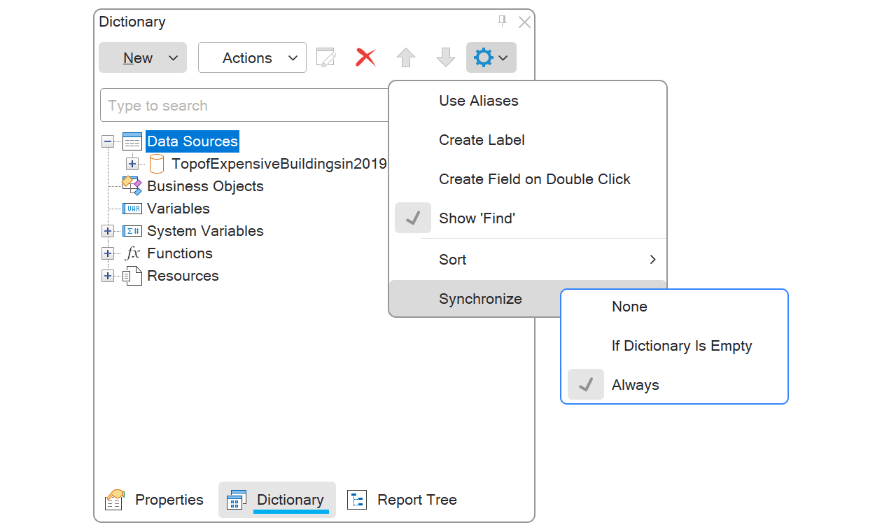 在报表设计器中添加了一项新功能,用于定义打开报表时的数据源同步行为。 该选项可在数据字典控制面板设置中找到,并可设置为以下值之一: