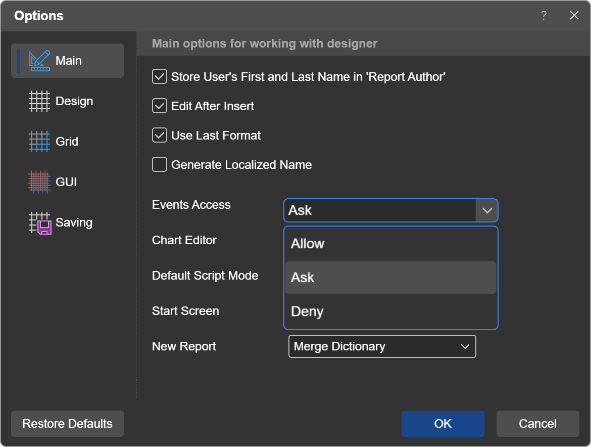 JS 报告设计器中引入了事件访问选项。 通过该功能,您可以定义在报告事件中执行代码时的行为,从而有机会在打开具有各种事件场景的报告时增强安全性。 您可以在报告设计器的选项菜单中的 "主要 "选项卡上配置该选项。