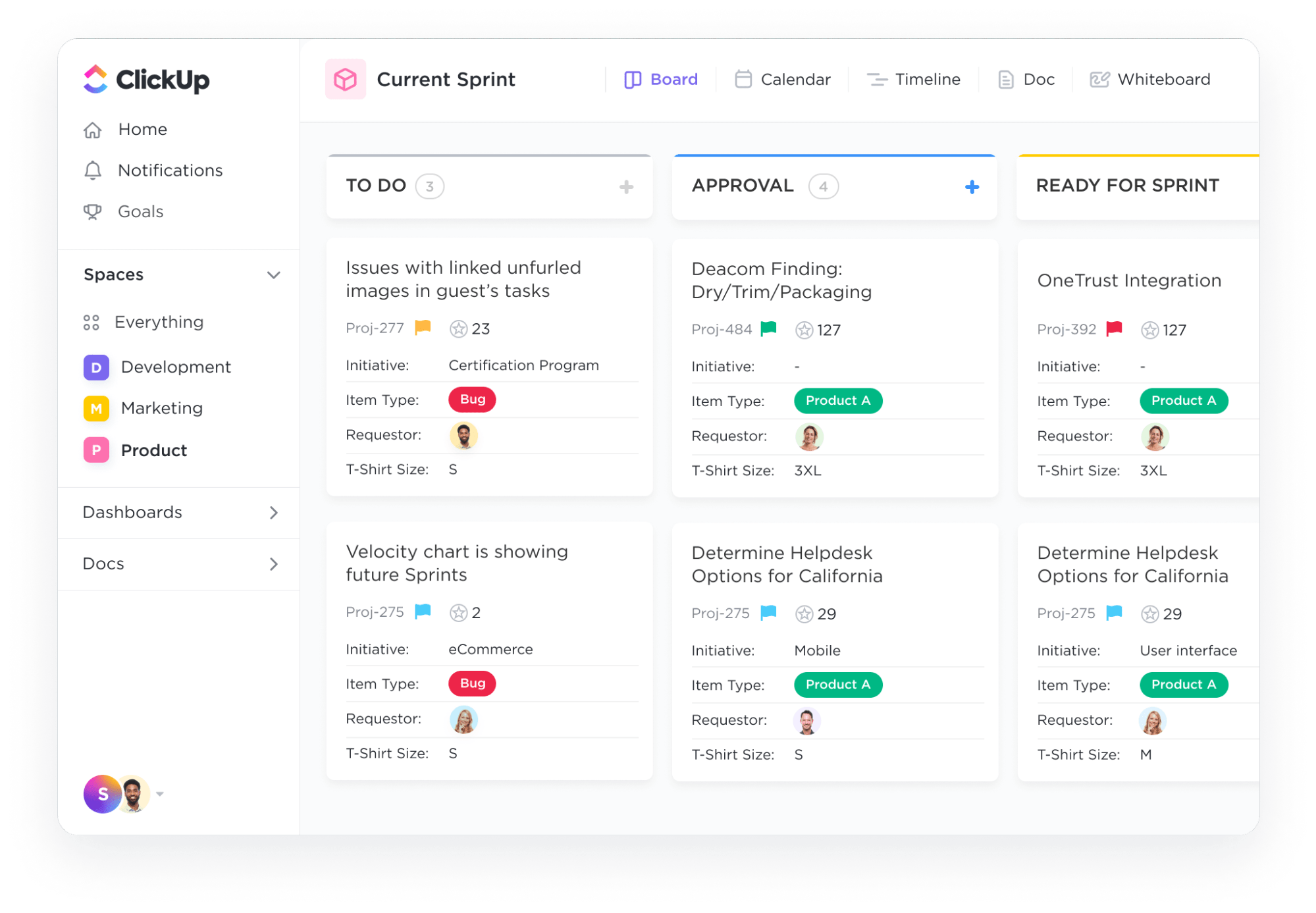 超过 15 种自定义视图可供选择: 用自己的方式查看工作,包括列表、表格、甘特图、日历和 Board 视图,让你为团队创建并有效管理完美的敏捷工作流程。ClickUp 中的 Board 视图可用作用户友好的错误跟踪板,帮助团队计划错误处理、管理敏捷项目、分解和分配任务,并更有效地与工程团队协作。至于简化错误接收流程,您的团队可以使用表单视图创建自定义表单,在收到提交后自动创建任务。