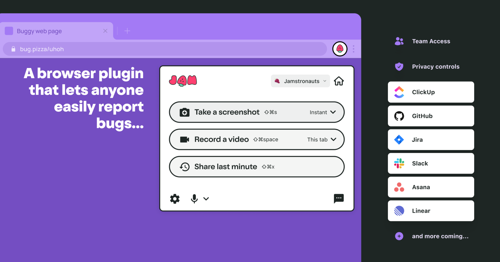 此外,Jam 还能与 ClickUp、Slack 和 Github 等最广泛使用的工具集成,从而轻松共享 QA 错误报告,为现有流程直接添加有价值的数据。