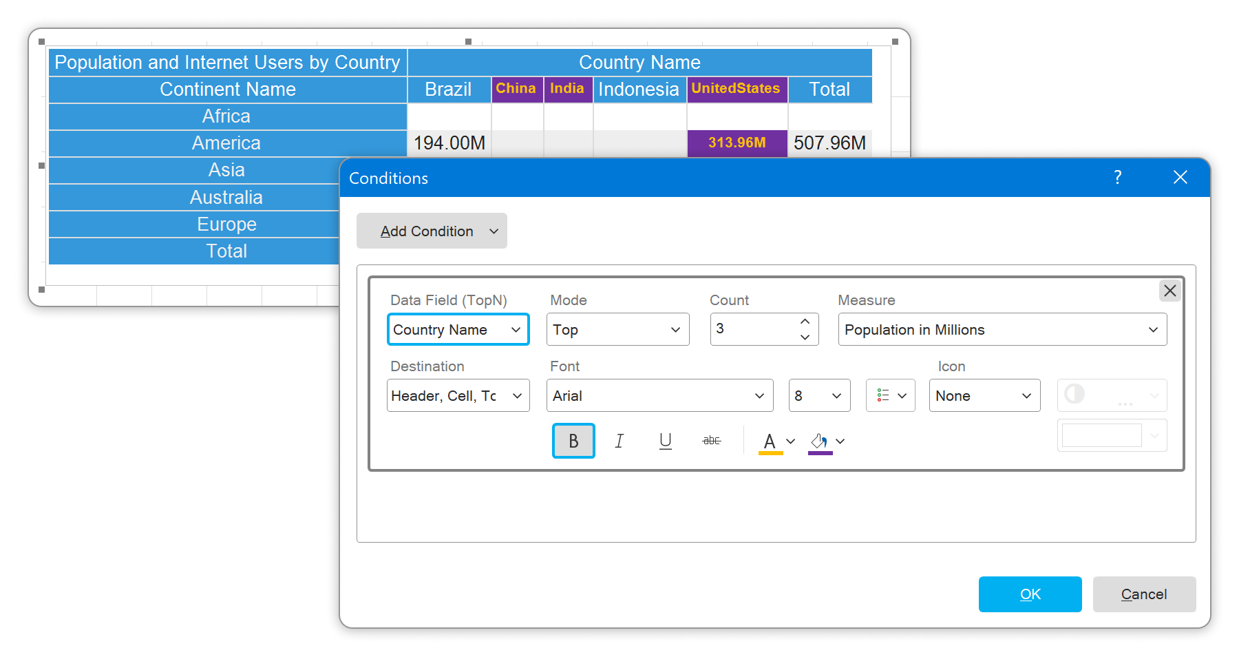 透视表仪表板元素现在可以有条件地格式化顶值。您可以指定关注最大值还是最小值,并确定要格式化的顶值数量。这样就可以更改文本或背景颜色、字体样式,并添加图标进行强调。这些设置可以在条件编辑器中通过选择特殊类型 TopN 进行配置。