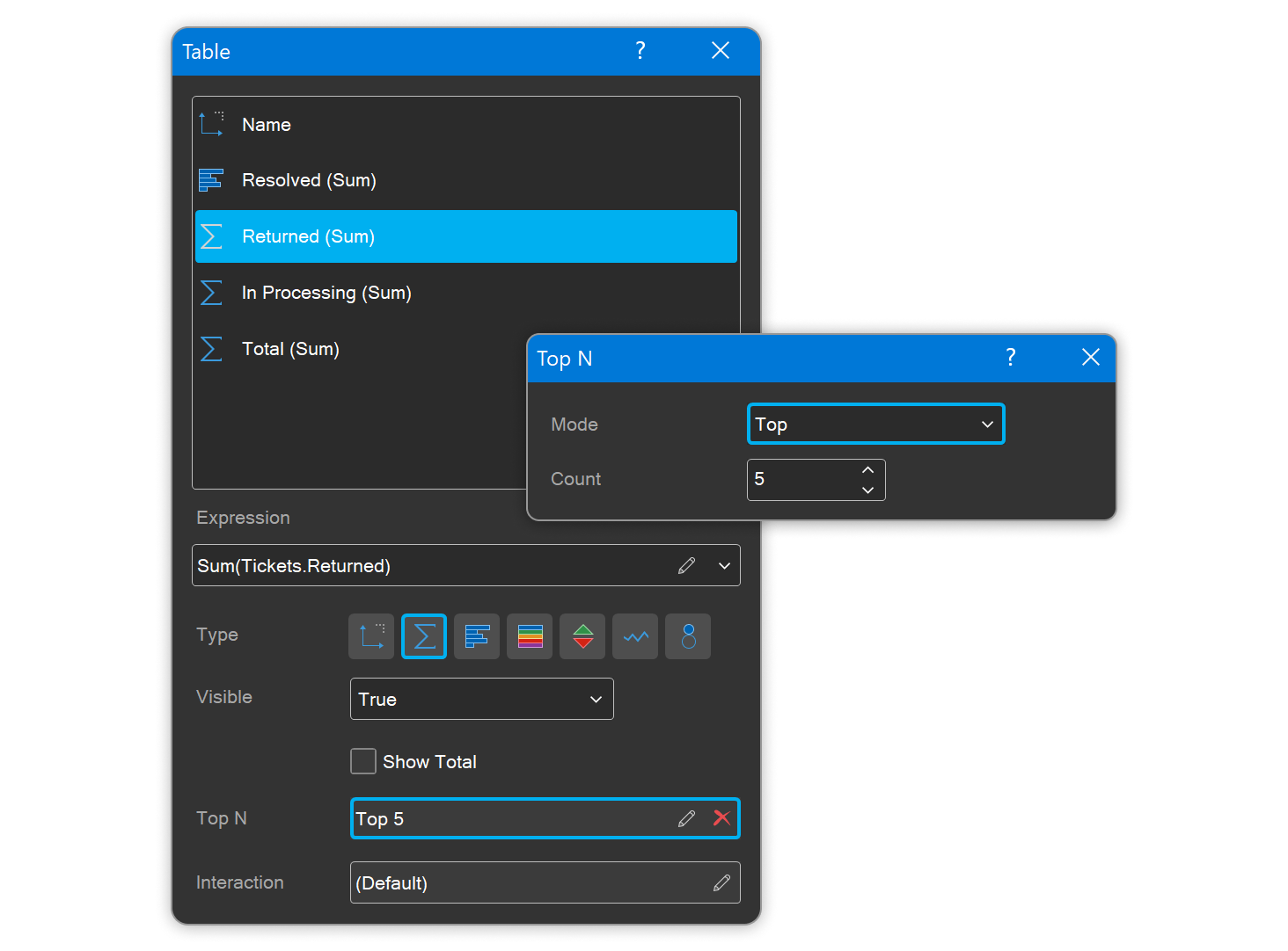 在 “表格 ”和 “卡片 ”仪表盘元素中的 “度量 ”字段增加了显示最佳值的功能。在仪表盘元素编辑器中,只需选择测量字段并访问 TopN 参数的编辑器。在这里,您可以指定要显示的最佳值数量并选择模式--顶部(最大)或底部(最小)。