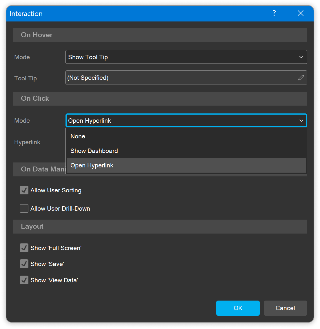 对于卡片和仪表板元素,我们添加了对交互式操作的支持,包括显示工具提示、显示超链接、显示仪表板和打开超链接。这些设置可以在元素交互编辑器中配置。
