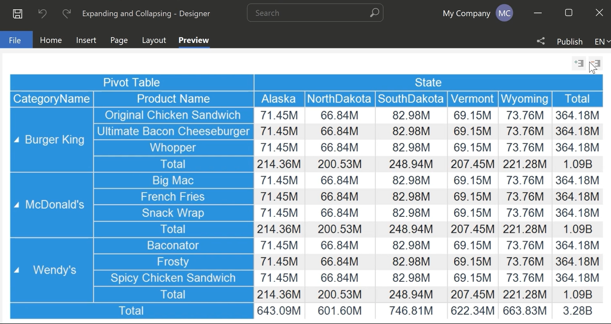 在数据透视表元素中,向行或列添加多个数据字段现在可以创建详细信息组,在查看仪表板时可以折叠和展开这些详细信息组。此外,数据透视表元素具有展开和折叠命令,允许用户一次展开或折叠所有组。这些命令可以在元素的交互编辑器中启用或禁用,从而更好地控制仪表板的交互和用户体验。
