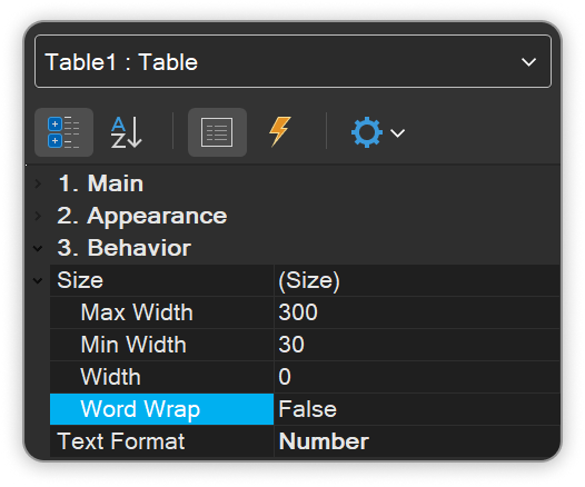 在版本2024.4.1中,我们引入了在Table仪表板元素中定义Measure列宽度的功能。这可以使用Size属性组进行配置,您可以在其中设置最大宽度、最小宽度或特定宽度,以及启用或禁用换行。