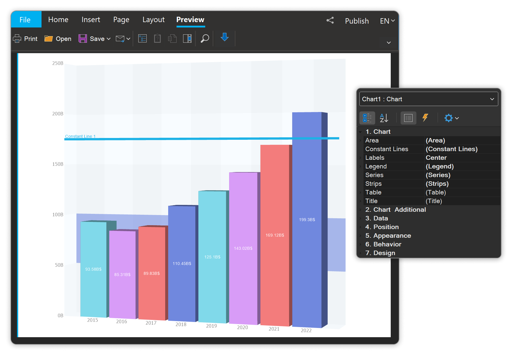 已为报告和仪表板中的3D图表添加了使用恒定线和条带的功能。这些功能可以按照与2D图表相同的方式进行配置,从而在不同图表类型之间实现一致的样式和增强的数据可视化。