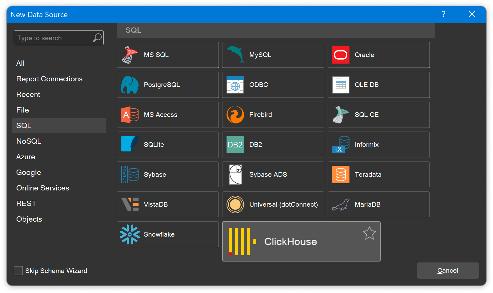 从2024.4版本开始,您现在可以直接从报表设计器连接到ClickHouse在线数据存储和交换服务。要建立此连接,只需在数据源创建窗口中选择ClickHouse类型,并指定数据仓库的连接字符串。