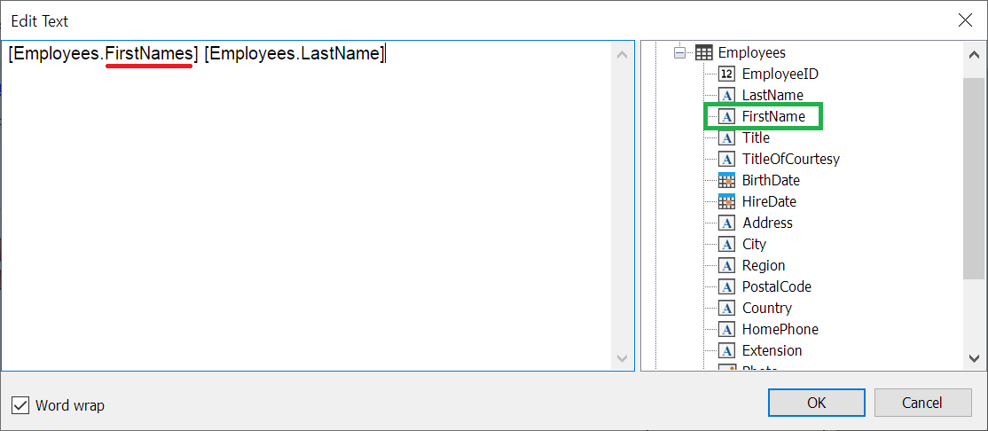 在这里您可以看到该表有一个名为 FistName 的字段,但它在表达式中没有正确指定。